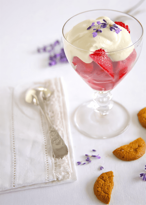 Разложить клубнику в сиропе по десертным бокалам или креманкам, увенчать взбитыми сливками, при желании украсить цветками лаванды или фиалки и подавать.