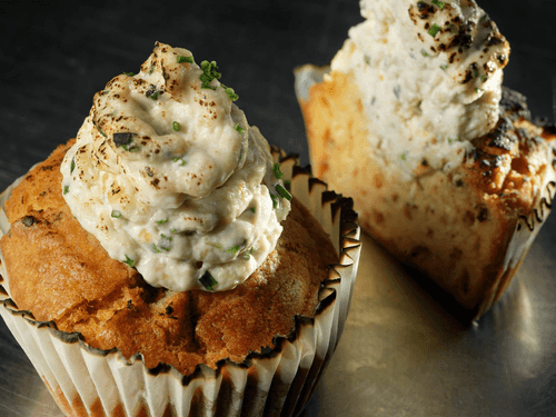 На готовые капкейки с помощью кулинарного мешка выложить крабовый крем и обжечь его газовой горелкой. Подавать теплыми.