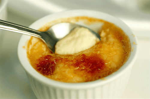 По истечении времени выньте пудинги из холодильника, посыпьте их сверху слоем сахара, примерно 2 столовыми ложками. Поставьте под сильно раскаленный гриль на пару минут до карамелизации сахара. Как только карамель покроет поверхность пудинга, подавайте.