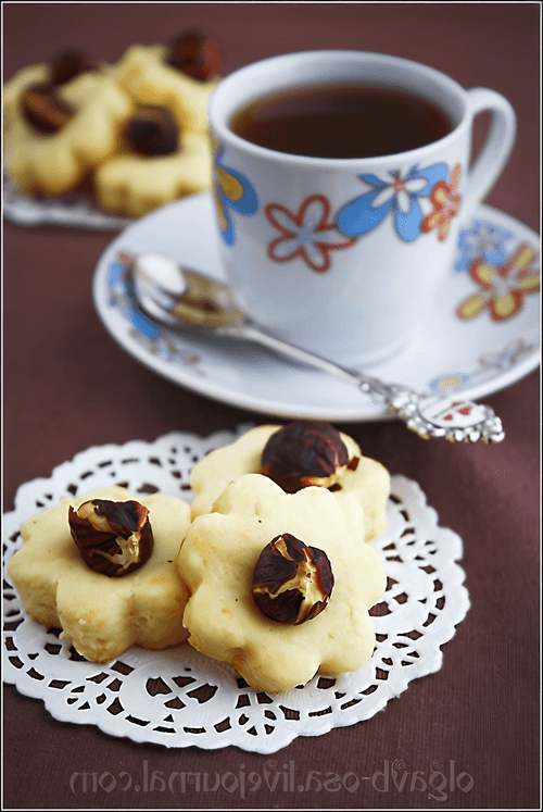 Украшаем каждое печенье фундуком. Ставим противень в разогретую до 180 градусов и выпекаем печенье в течение 15 минут до золотистого цвета. Охлаждаем и подаем.