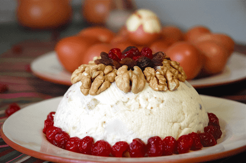 Затем вынуть пасочницу из холодильника, осторожно снять форму, стараясь не повредить спрессованный нежный барельеф. Осторожно убрать марлю и украсить пасху.