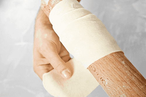 Обернуть каждую полоску вокруг основы внахлест. (В домашних условиях для этих целей можно использовать скалку или трубки из плотного картона, покрытые фольгой.) Краешек теста аккуратно подоткнуть.