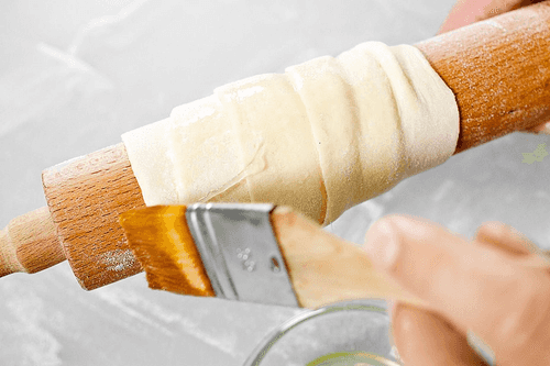 Кулинарной кисточкой тщательно смазать со всех сторон белками намотанное на основу тесто. Духовку разогреть до 200 градусов.