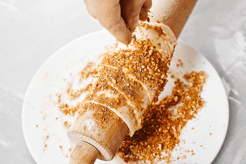 Сделать смесь из молотых орехов, столовой ложки сахара и корицы, высыпать на плоскую тарелку и прокатать по этой смеси тесто. Установить основы с тестом над небольшим противнем и поставить в духовку.