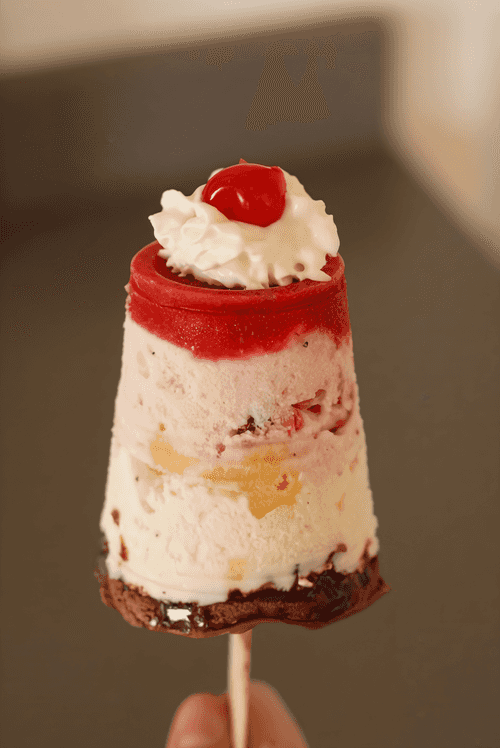 Бананы сплит на палочке — это игривая интерпретация классического американского десерта, созданного для удобства и веселья. Вдохновленный оригинальным банановым сплитом, который появился в начале XX века, этот вариант подается в замороженном виде на палочке, делая его идеальным летним лакомством. Сладкие бананы сочетаются с тремя видами мороженого — ванильным, клубничным и шоколадным, создавая богатый и многослойный вкус. Ананас добавляет фруктовую свежесть, а шоколадный и клубничный соусы усиливают сладкую насыщенность. Финальным штрихом служат грецкие орехи, которые добавляют хруст и глубину вкуса. Завершают композицию взбитые сливки и коктейльные вишни, придавая десерту праздничный вид. Этот десерт идеально подходит как для детских праздников, так и для веселых встреч в кругу семьи.