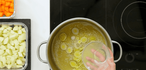 Белую часть порея (вместо него можно использовать репчатый лук) нарезать тонкими кружочками, выложить в кастрюлю с коричневым сахаром, карамелизовать до золотистого цвета.