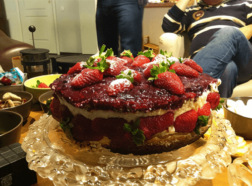 Ягодное желе выложить на крем и охладить в холодильнике. Торт украсить ягодами и листиками мяты.