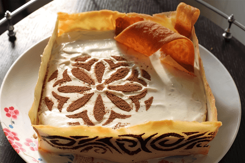 Достаньте торт из холодильника. Нанесите оставшийся крем на верх и бока торта. Положите на торт трафарет и присыпьте его какао. Аккуратно снимите трафарет, стараясь не смазать рисунок.