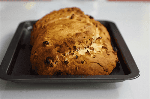 Отправить штоллен в разогретую духовку и печь 60–70 минут. Штоллен должен немного подрасти и хорошо подрумяниться.