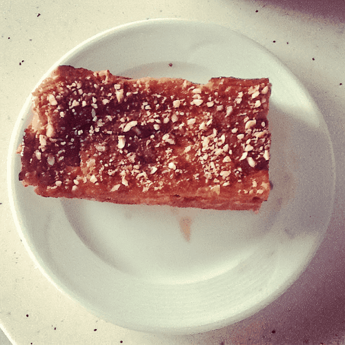 Выкладываем в форму, сразу сверху посыпаем орехами.