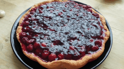 На готовую выпеченную основу выкладываем вишни (без жидкости) и ставим полуфабрикат в холодильник.