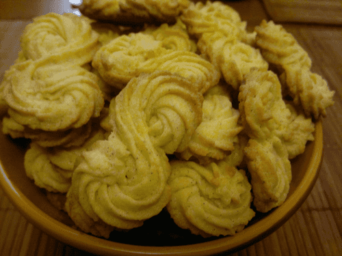 Смешать в миксере размягченное масло, сахар, ваниль, вбить яйца, постепенно всыпать смесь муки с полентой (если слишком густо, влить пару ложек воды). Тесто должно получиться достаточно крутым, но в то же время пластичным, чтобы его можно было выдавить из кондитерского мешка.