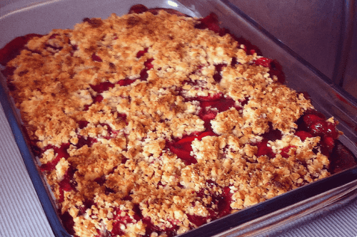 На полуготовый корж вылить клубничную начинку, равномерно распределить по ней песочные крошки и отправить в духовку минут на 40. Свидетельством готовности пирога будут золотистый цвет и наркотически приятный аромат))