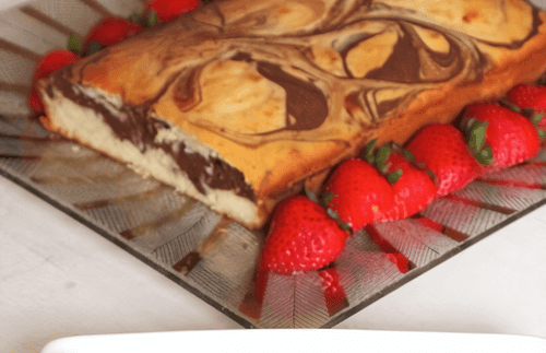 Вылейте половину белого теста в форму, разровняйте лопаточной. Вылейте шоколадное тесто и закройте оставшимся ванильным (не перемешивайте пока). Теперь ножом сделайте легкий рисунок по сырому тесту (S или вперед-назад зиг-загом). Но не переусердствуйте, иначе не получится эффект мрамора.
