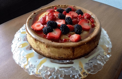 Охладить чизкейк. Вынуть из формы. Выложить на тортовницу и сверху полить карамельным соусом. Если по бокам есть место, украсить капельками сгущенки. По желанию — ягодами.