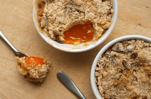 Засыпьте персики крошкой из теста и отправьте в духовку на 30–35 минут.
