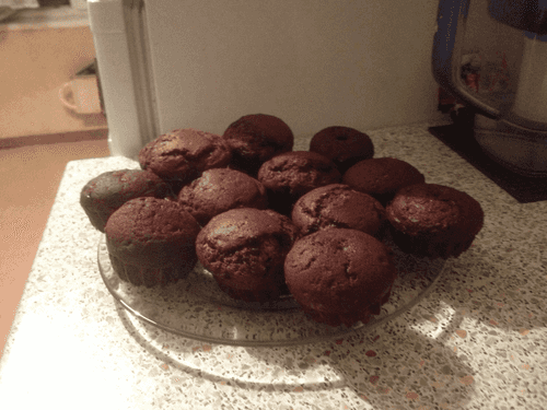 Достаньте шоколад из холодильника и нарубите его кубиками, размером с горошину. Положите кусочки шоколада сверху на каждый маффин и добавьте теста еще на 1/4 формочки. Формы в итоге должны заполниться на 2/3.
