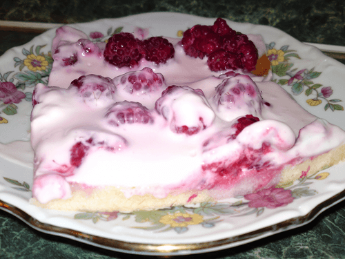 На готовый корж положить малину и залить сметаной. Убрать в холод на пару часов.