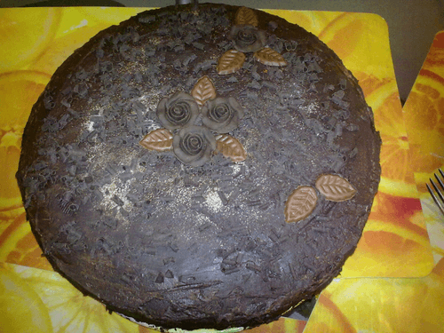 Поверхность торта с боков облить горячим растопленным шоколадом, смешанным с 1–2 столовыми ложками молока, и разровнять глазурь ножом, смоченным в горячей воде. Торт хорошо охладить, украсить по желанию.