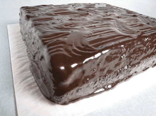 Остывший корж, разрезать на 4 одинаковых квадрата, удалить бумагу для выпечки и сложить торт, смазывая коржи шоколадным кремом.