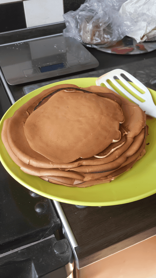 Разогреваем сковороду (желательно легкую, диаметром не более 26 см, т.к. блины будем переворачивать в воздухе, без лопаточек и прочих приспособлений). В слегка дымящуюся сковороду наливаем половину столовой ложки растительного масла, распределяем его равномерно по всей поверхности сковороды. Большой ложкой или маленьким половником наливаем в центр сковороды тесто и быстрыми круговыми движениями распределяем его по всей поверхности. Температура разогрева плиты должна быть максимальная. Видим, как тесто начинает схватываться по краям, образуя корочку, в этот момент берем сковороду и резкими движениями начинаем ее покачивать по горизонтальной траектории. В этот момент происходит отслоение блина от горячей поверхности сковороды (если блин не хочет отделяться, можно ему немного помочь, но не переворачивая его). Манипулируя сковородкой, делаем одно резкое подбрасывающее движение, и переворачиваем блин в воздухе (не переживайте, если этого не получилось сразу, помните — ПЕРВЫЙ БЛИН ВСЕГДА КОМОМ.