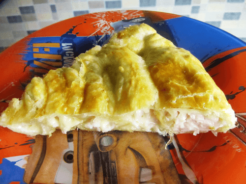 Так, по кругу, заполняем всю форму, сверху смазываем желтком и ставим в разогретую духовку. Запекаем до золотистого цвета.