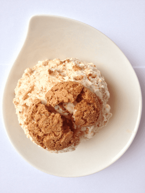 Доставьте крем из холодильника, перемешайте, перелейте во фризер для мороженого и прокрутите в соответствии с инструкцией минут 20–40. В последнюю минуту прокручивания добавьте мелко раскрошенное печенье амаретти. В конце прокручивания масса будет напоминать чуть подтаявшее мягкое мороженое. Наполните этой массой контейнер и отправьте в морозилку на 3–4 часа до застывания.