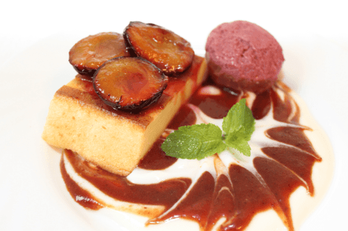 На тарелки выложить по 2–3 ложки йогурта, сверху налить сливовый соус, сделать разводы зубочисткой. Запеканку украсить карамелизованными сливами. Можно добавить шарик мороженного и листик мяты.