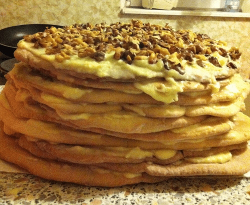 Готовые коржи остудить (станут твердыми), смазать кремом, посыпать порубленными жареными грецкими орехами. Поставить в холодильник на сутки (или на ночь) пропитаться.