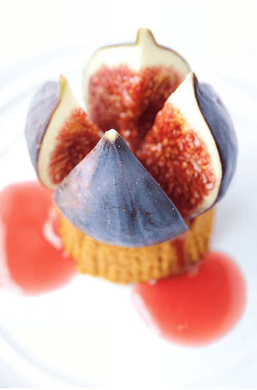 Для презентации, срезать ровно верхушку кекса и положить его на тарелку вверх дном. Инжир надрезать крестообразно и выложить сверху на кекс. Чайной ложкой аккуратно полить малиновым сиропом инжир на кексе так, чтобы сироп стекал по стенкам кекса на тарелку.