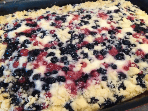 В форму для выпечки (20–25 см в диаметре) высыпать половину теста, сверху равномерно распределить творожную начинку, а затем — ягоды и слегка вдавить их в творожную массу. Засыпать второй половиной теста.