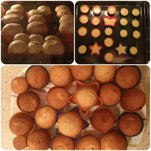 После того, как кексы поднимутся и только начнут подрумяниваться (примерно через 5 минут), убавить до 180 градусов. Вынимать, когда кексы примут румяный, коричневатый вид (где-то через 5–10 минут). Дать остыть и после вынимать из формочек.