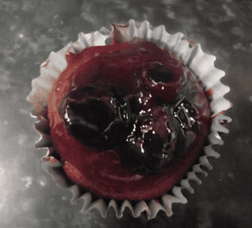 Выложить тесто в формочки для кексов, сверху положить вишню. Выпекать 25 минут.