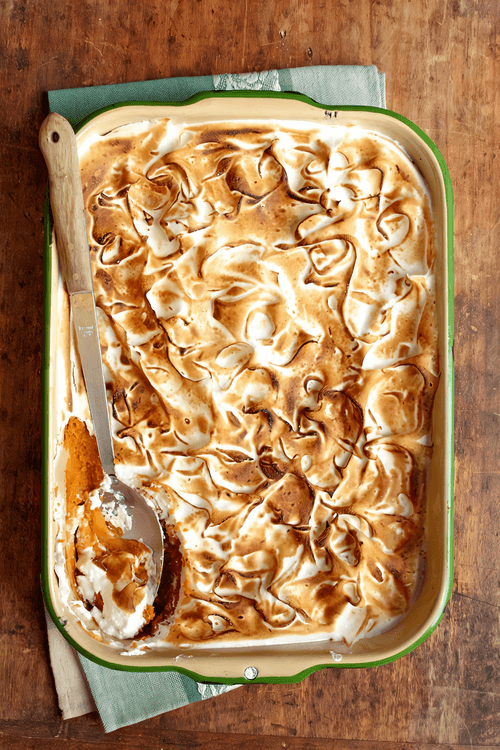 Поднять температуру в духовке до максимума. Достать форму с картофелем и распределить безе на поверхности запеканки. Вернуть в духовку и запекать несколько минут, пока верхушки безе не станут коричневого цвета.