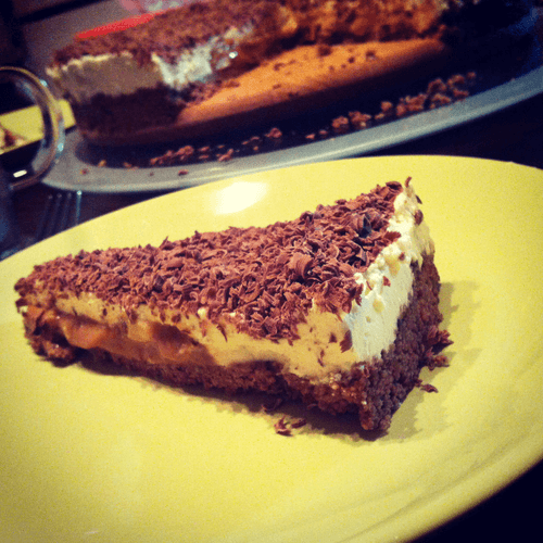 Баноффи кейк — это настоящий шедевр британской кухни, родившийся в 1970-х годах в Англии. Его название образовано от сочетания двух главных ингредиентов: банана и ириски (toffee). Нежная основа из песочной крошки, пропитанная ароматным сливочным маслом, создает идеальную текстуру для насыщенного слоя карамелизированного сгущенного молока и свежих бананов. Вершиной этого удовольствия становятся воздушные сливки, щедро покрытые шоколадной стружкой, добавляющей изысканную глубину вкуса. Этот десерт — воплощение сладкой гармонии: мягкий, кремовый, с тонкими нотками ванили и шоколада. Он идеально подходит для уютных семейных чаепитий или как изысканный финал романтического ужина, оставляя после себя теплое ощущение удовлетворения и счастья.