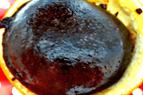 Аккуратно, ложкой, вынуть из них мякоть и весь сок. Старайтесь не повредить чашечку!. Если чашки плохо стоят, можно осторожно подрезать снизу — смотрите, не до дыр!). Сок частично сохранить (остальное употребить в коктейль seх in the kitchen). На водяной бане или в микроволновке растопить горький шоколад с маслом. Чуть остудить и добавить яйца, сахар, сок, коньяк и миндаль. Не забыть коньяк оставить на отхлебнуть.
