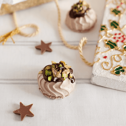 Шоколадные меренги под апельсиновым шоколадом и фисташковой крошкой