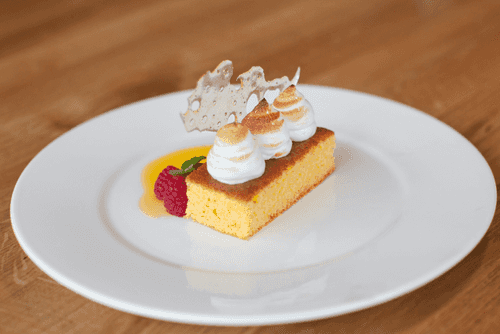 Вылить на тарелку 1 столовую ложку апельсинового соуса, положить кусочек пропитанного ромовым сиропом кекса, сверху украсить меренгой при помощи кондитерского мешочка и опалить верхушку полученного десерта газовой горелкой. Подавать со свежими ягодами, листьями мяты и карамельным декором.