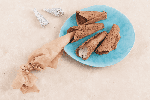 Выньте противень, переложите пергамент с блинчиками на стол, подденьте блинчики лопаткой и сверните в трубочку на заготовке из фольги; оставьте остывать.