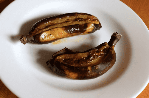 Положить на горячий гриль на 5–8 минут с каждой стороны или запекать в духовке при 150 градусах минут 15–20. Или положить на горячую сковороду на 5–8 минут с каждой стороны. Время зависит от того, насколько сильно вы хотите, чтобы размяк банан.