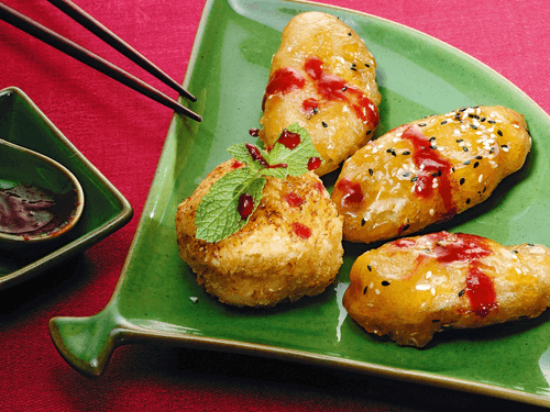 Бананы разрезать вдоль, обмазать тестом и обжарить во фритюре до румяной корочки — около семи минут. Разогреть вок, налить в него немного воды, засыпать сахар и кунжут и обжарить в воке бананы — сахар должен карамелизоваться.