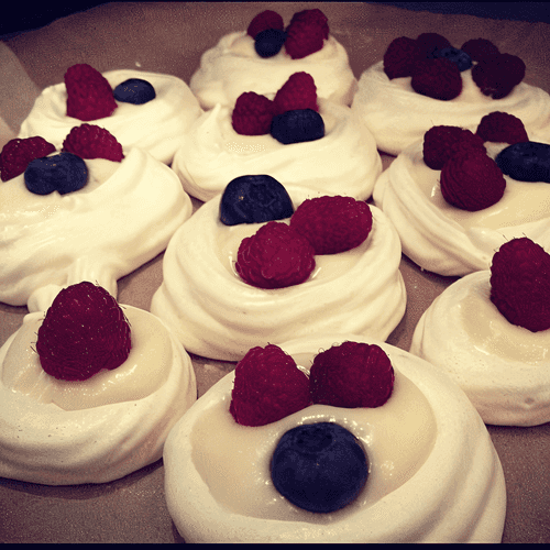 Готовым безе дать остыть. Наполнить кремом и украсить ягодками и листиками мяты.