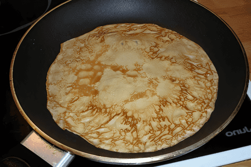 Выпекать блины на разогретой и смазанной маслом сковороде. Чтобы получить ровный слой масла, его не льют на сковороду, а смазывают сковородку маслом перед выпечкой каждого блина. Лучше всего смазывать сковороду маслом половинкой луковицы (или сырой очищенной картофелиной), разрезанной поперек и наколотой на вилку.