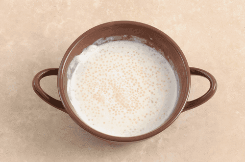 Залейте отваренную тапиоку молоком и варите на сильном огне еще 5 минут, периодически помешивая; переложите тапиоку в миску, накройте пленкой, сделайте в пленке 1 прокол ножом и уберите в морозилку на 20 минут.