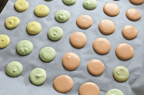 Отсадить на пергамент разноцветные лепешечки и оставить минут на 40 на кухонном столе. Пока не подсохли. Корочка образовалась быстро, на кухне жарко. Выпекать 15 минут при 150 градусах. Готовые половинки легко отстают от бумаги. Переложить на деревянную доску, дать остыть. Тем временем, приготовить ганаш из белого и черного шоколада.