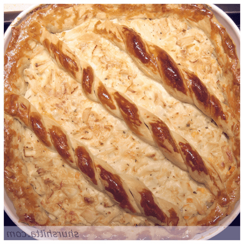 Слегка отваренную курицу расщепляем на волокна, режем маленькую морковку и маленький лук. Выкладываем все на остывшее тесто и заливаем нашей яично-сметанной смесью. Аккуратно разравниваем вилочкой, чтобы все было в соусе.
