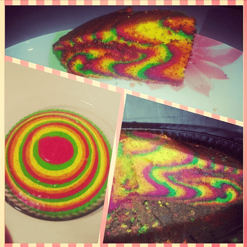 Форму для выпечки (у меня форма диаметром 26 см) смазать растительным маслом (силиконовую форму можно не смазывать). Вылить 2–3 столовые ложки зеленого теста в середину формы. В серединку зеленого теста вылить 2–3 столовые ложки розового теста. В середину розового — 2–3 столовые ложки желтого теста, потом — соответственно, оранжевого. И всю процедуру повторять, пока тесто не закончится.