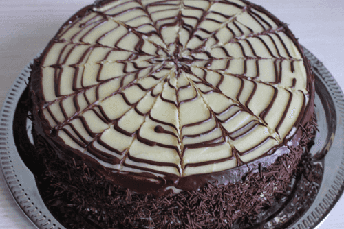 Растопить черный шоколад, перелить в кондитерский мешок и нарисовать на торте спираль, начиная от середины к краю. Когда шоколад немножко схватится, кончиком ножа провести полосы через равные промежутки — сначала от середины торта к краю, а затем от края к середине.