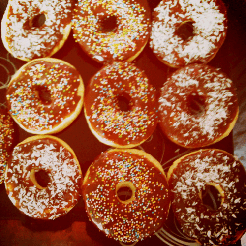 Выложим глазурь в широкую посуду и окунем в нее остывшие пончики, выложим их на тарелку и посыпем кокосовой стружкой или пищевыми конфетти.