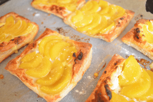 Половинки абрикосов или персиков нарезать на пластиночки и выложить их на слойки.